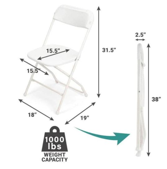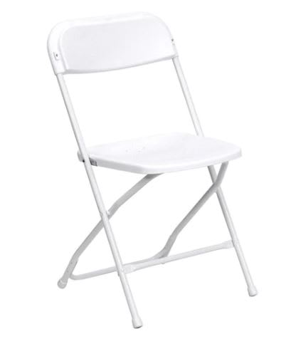 These are probably the most popular chairs in the party rental business, and we have them. Solid white, sturdy frame and comfortable back and seat. And they have a 300 pound weight capacity. These are a must for any birthday party, corporate, school or church event, or even weddings! Easy to folding for creating that perfect seating arrangement.